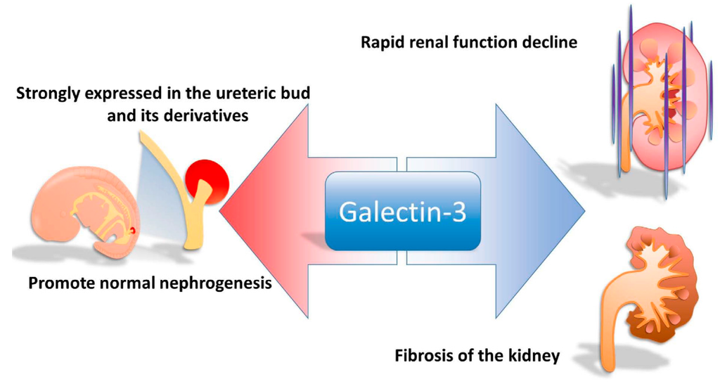 Galectin-3 is a 32- to 35-kDa member of the galectin family of b-galactoside-binding lectins, which is characterized by a carbohydrate recognition domain. Through its carbohydrate-binding function, it regulates cell growth, differentiation, and inflammation. It also plays a complex, context-dependent role in the kidneys. During development, it promotes nephrogenesis and is strongly expressed in the ureteric bud and its derivatives. An increase in the concentration of galectin-3 has been reported to be associated with fibrosis of the kidneys. Elevated levels of plasma galectin-3 are also associated with increased risks of rapid renal function decline, incident chronic kidney disease, and progressive renal impairment, and also with cardiovascular end points, infection, and all-cause mortality in patients with renal function impairment. This review discusses a general survey on galectin-3 expressions in nephrogenesis, kidney injury animal models, clinical renal diseases, renal transplantation and the potential role of galectin-3 for treatment in kidney disease.