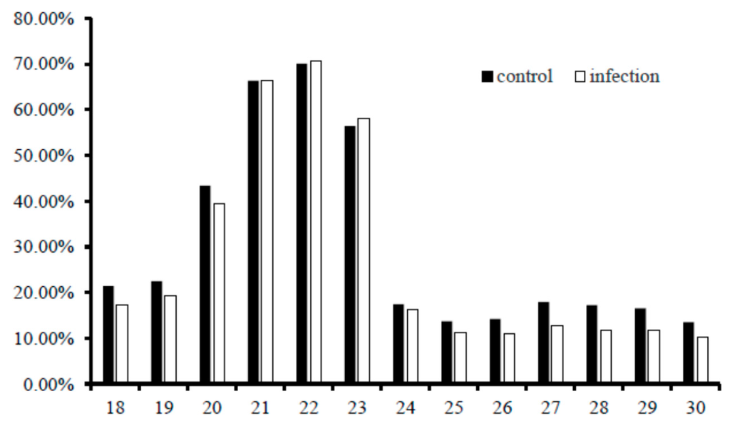 To investigate the miRNA expression profiles of the liver of common carp, the cDNA library of small RNAs was constructed with pooled total RNAs from liver tissues collected from 10 common carps infected with FC or control. Through IlluminaHiseq2500, 19,619,555 and 18,776,497 raw reads were obtained from control and FC-infected samples, respectively; After removal of low quality reads (the 5′ and 3′ adapters, reads containing ploy-N, reads with sequences smaller than 18 nt or longer than 30 nt), 16,907,877 (94.94%) and 13,599,310 (94.58%) high-quality (Q30) clean reads were extracted from control and infected samples, respectively (Table 1). Using Bowtie software searches against Silva database, GtRNAdb database, Rfam database, and Repbase database, 3,210,400 (18.99%) and 3,758,445 (27.64%) of the clean reads from control and infected samples, respectively, were annotated as either repeat base, rRNA, snRNA, snoRNA, scRNA or tRNA. Given the genome of common carp is available, the clean reads small RNAs 16,907,877 (control) and 13,599,310 (infected) were mapped to the common carp genome using miRDeep2 software. In the case of the control sample, 9,181,153 (54.3%) of miRNA clean reads were mapped to the common carp genome. While in the infected samples, 6,479,172 (47.6%) of miRNA clean reads were mapped to the common carp genome (Table 1). The length distribution of the miRNA mapped rate was analyzed and a similar trend of the distribution was observed in the two samples. Higher miRNA mapped rates were observed in small RNAs with 21–23 nt in length (Figure 1).