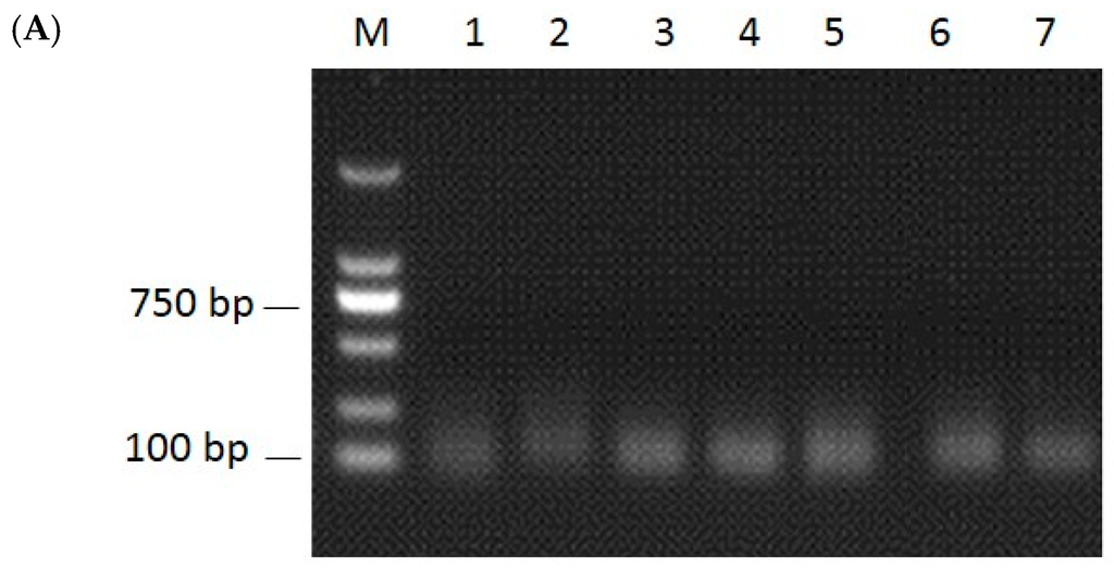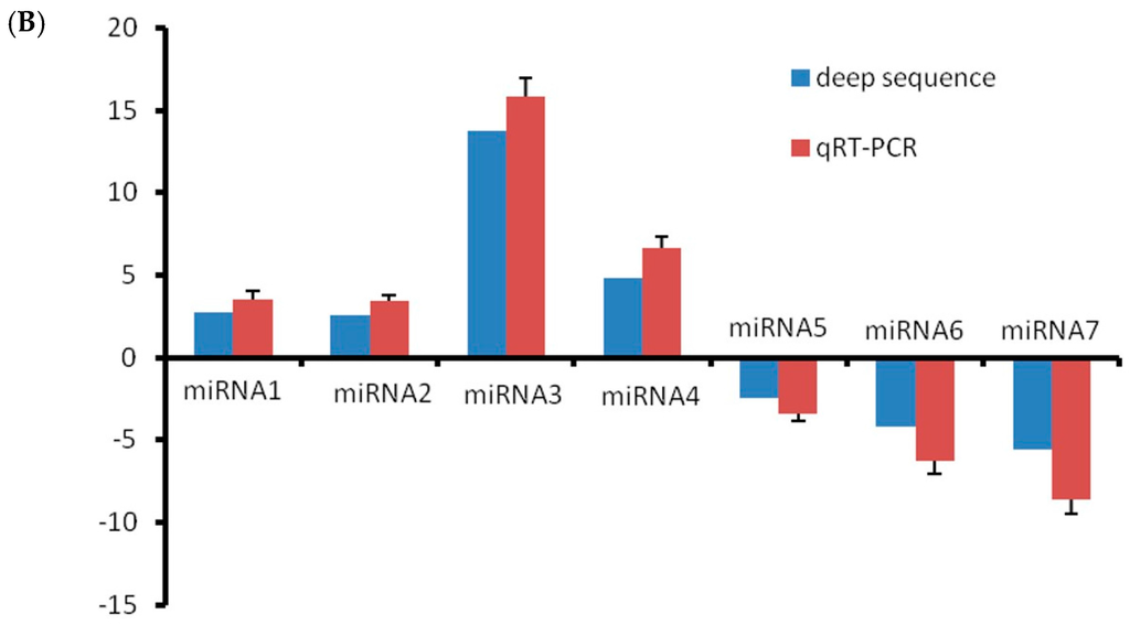 2.2. Identification of miRNAs and Validation by RT-PCR and qRT-PCR