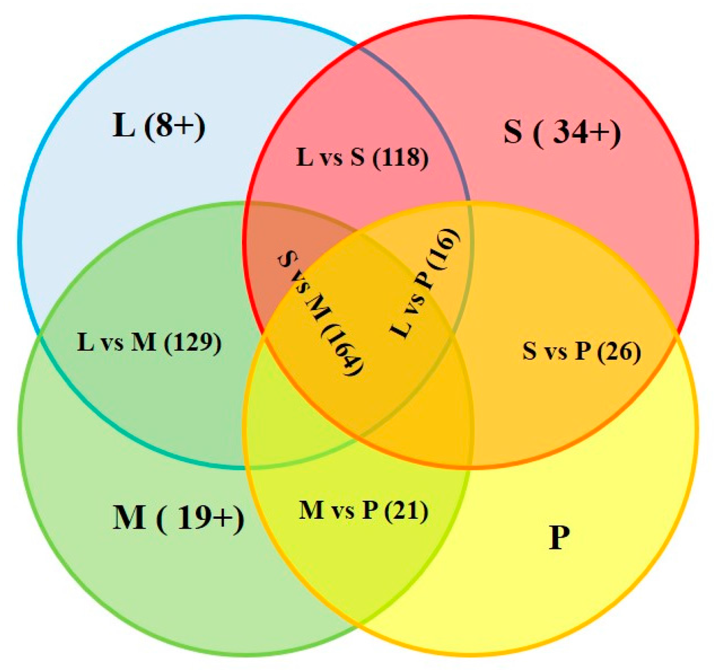 Comparison of miRNAs from different tissues of common carp. The number of over-lapping is shown in the parentheses. Tissue specific miRNA is shown in the parentheses and marked with “+”. L, S, M, and P represents liver, spleen, skeletal muscle and pooled tissues, respectively.