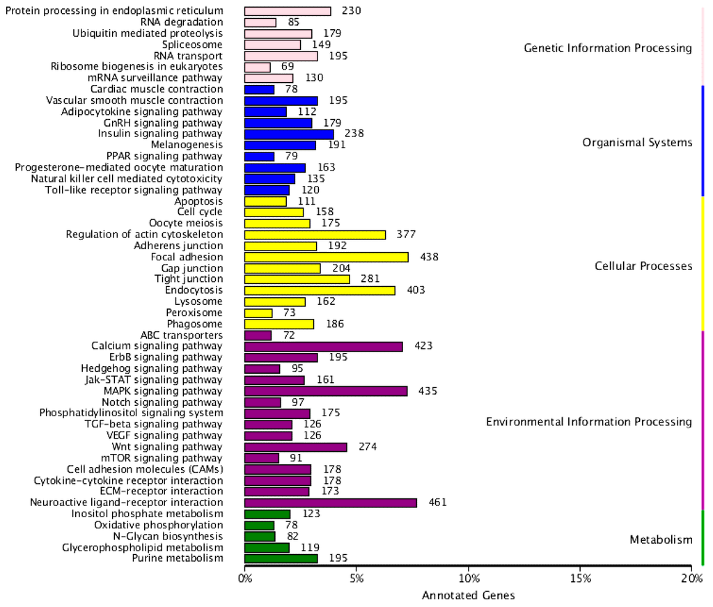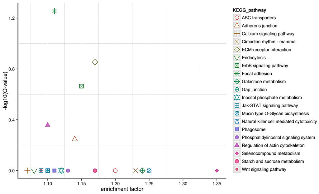 To better understand the functions of miRNAs in the liver of common carp, the target genes of miRNAs in common carp were predicted using miRnada (Available online: http://www.microrna.org) and RNAhybrid (Available online: http://bibiserv.techfak.uni-bielefeld.de/rnahybrid/) softwares. There were totally 52,537 target genes of the identified 698 miRNAs. More than 91.3% (47,982 out of 52,537) of the target genes could be annotated. The 30 DIE-miRNAs target genes were 27,363 which were grouped into genetic information processing, organismal systems, cellular processes, environmental information processing, and metabolism clusters. Furthermore, neuroactive ligand-receptor interaction, focal adhesion, mitogen-activated protein kinase (MAPK) signaling pathway, regulation of actin cytoskeleton, and endocytosis were the top five clusters (Figure 4). When the target genes were further subjected to KEGG pathway enrichment analysis, the results showed that there were five significant enriched pathways as following: Focal adhesion (Q = 0.056), ECM-receptor interaction (Q = 0.140), ErbB signaling pathway (Q = 0.217), Regulation of actin cytoskeleton (Q = 0.439), and Adherent junction (Q = 0.567) (Figure 5).