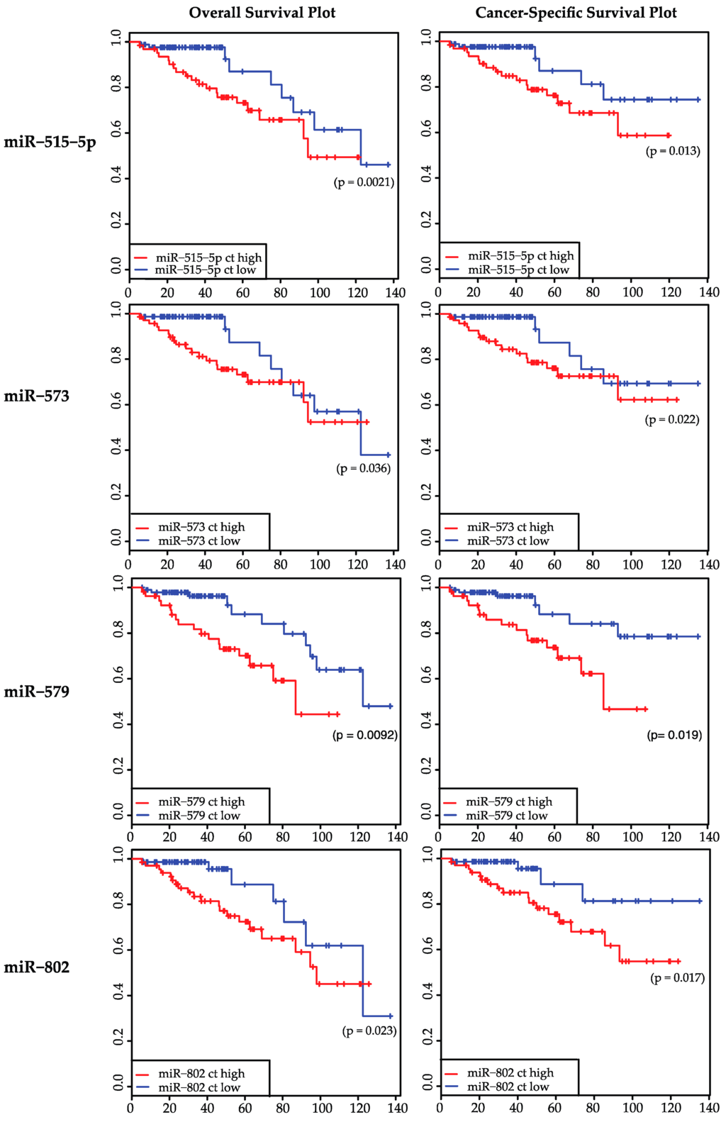 2.2. Expression Levels of 19 miRNAs Were Analyzed in 147 Samples: miR-515-5p, miR-573, miR-579, and miR-802 Were Significantly Correlated to Overall Survival and Cancer-Specific Survival