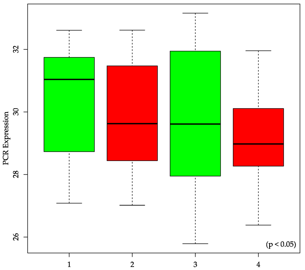 The miRNA PCR values of 19 miRNAs of 147 patients were normalized using housekeepers miR-202, miR-874 and small nuclear RNA U44 (SNORD44). These miRNAs were selected from the genome-wide screening and showed the least level of variability over all samples and represented miRNAs of high, medium, and low expression. Survival analysis of this data was performed as well as analyses of variance in order to assess two linear models of miRNA expression levels and clinical parameters []. These linear models included the expression level as dependent variable and the independent variables nodal state and tumor regression grade respectively. A significant outcome with p < 0.05 suggests an association of miRNA expression and the respective clinical data.