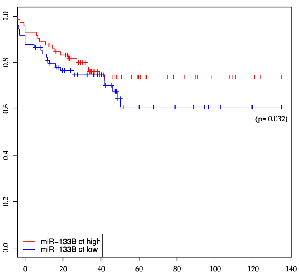 For miR-133b expression in treatment-naïve rectal cancer tumor biopsies, a significant association with DMS has been shown (p = 0.032). Patients with a low expression level of miR-133b develop more frequently distant-metastasis. miR-133b is the only miRNA (among the investigated miRNAs in this study) being significantly associated to distant-metastasis-free survival, while it does not show any significant association with other clinical parameters according to our analysis. Figure 3 shows distant-metastasis-free survival dependent on a high and low expression of miR-133b in the tumor biopsies, respectively.