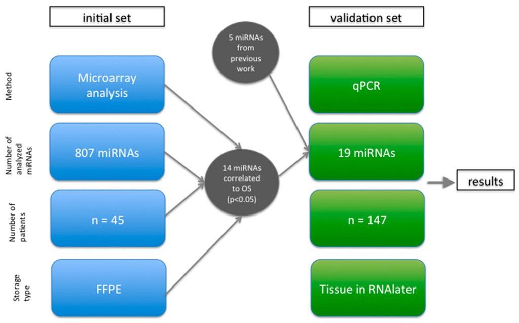 Study design: On the left, the initial set of 45 patients’ formalin-fixed paraffin-embedded (FFPE) samples analyzed via microarray analysis is shown. The results of that analysis showed a significant correlation (p < 0.05) of 14 miRNAs to overall survival (OS). These miRNAs together with 5 further miRNAs from previous work were analyzed in 147 patients’ samples (preserved in RNAlater), which were analyzed via quantitative real-time polymerase chain reaction (qPCR). The results are explained in the result paragraph.