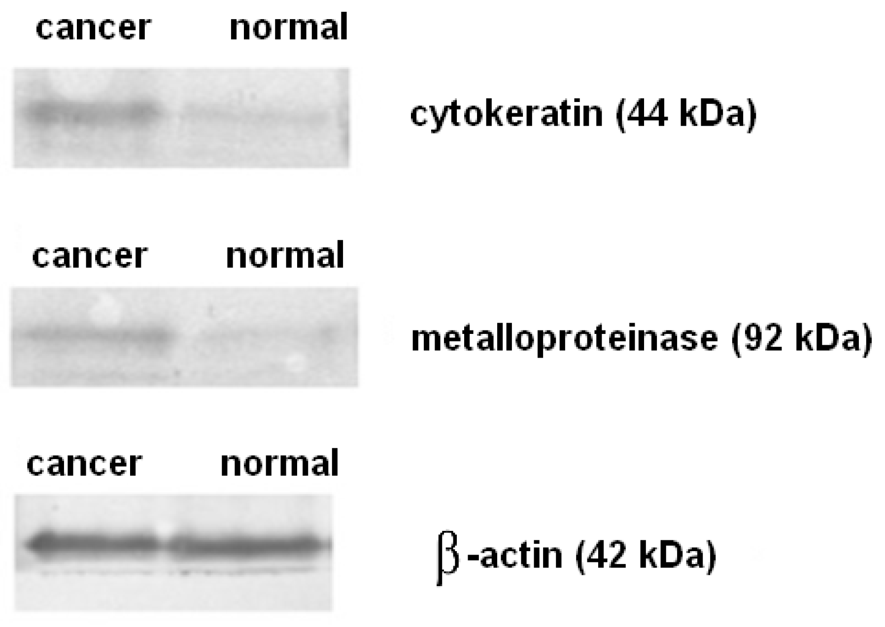 Figure 2 shows Western blot for CK19 and for MMP-9 of sentinel lymph node from the patient with metastatic breast invasive carcinoma NST G2. It can be seen clearly that the protein level of cytokeratin 19 and metalloproteinase 9 was substantially higher than that of normal tissue.