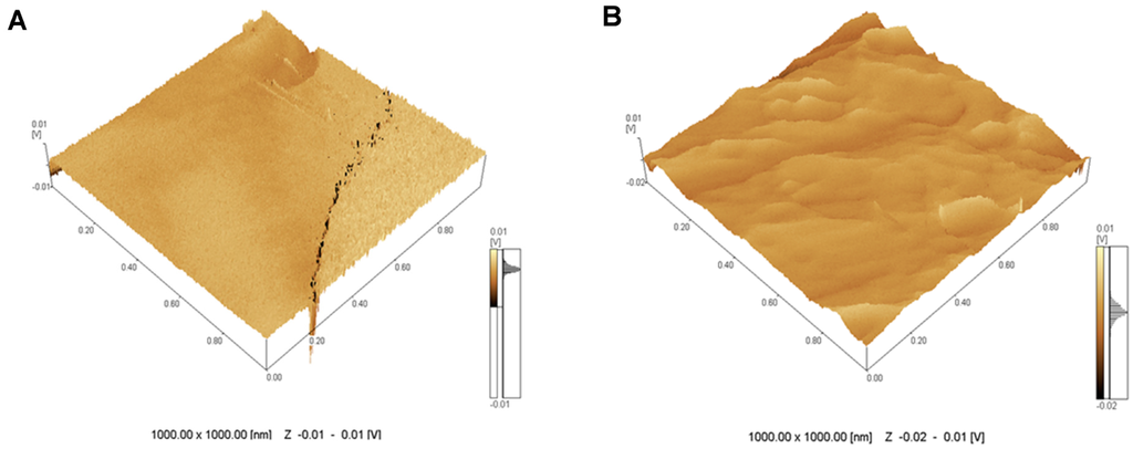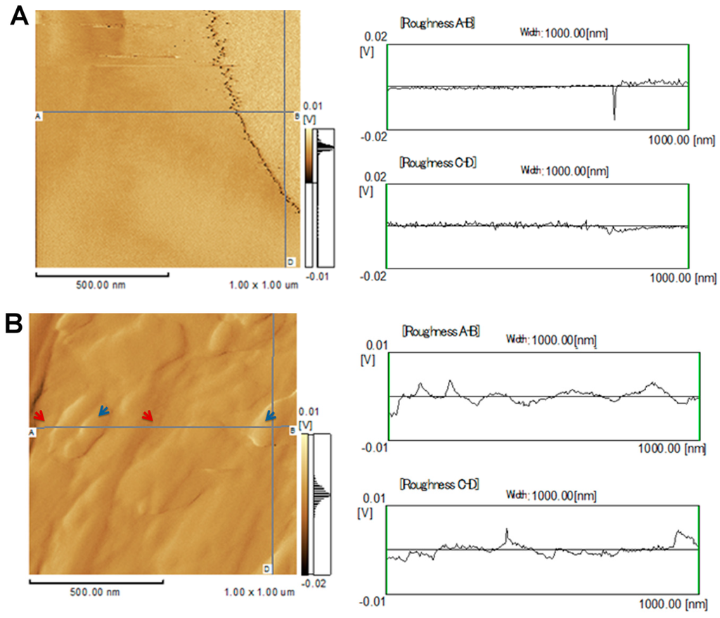 All AFM images were captured via a Shimadzu AFM (SPM-9600 series, Shimadzu Corporation, Tokyo, Japan) using Si3N4 cantilever tips (model OMCL-TR, Olympus, Tokyo, Japan), with a nominal spring constant of 0.57 N/m and a resonance frequency of ≈73 kHz. The 512 pixels × 512 pixels AFM images were acquired with a scan rate of 1 Hz and a scan size of 1000 nm. Non-functionalized tips were used to measure the adhesion force. The force-distance measurements were obtained using dry samples and recorded in contact mode at room temperature (25 °C).