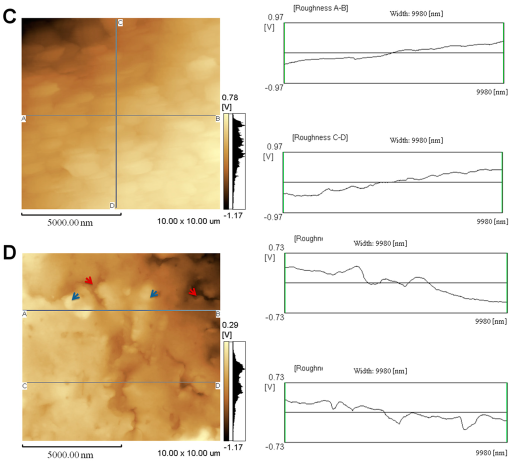 Representative two-dimensional atomic force microscopy (AFM) images and roughness profiles of the papaya leaf midribs (A,B) and latex (C,D) of healthy (A,C) and PMeV-infected papaya plants (B,D). Superficial differences between the samples from the healthy and infected plants. The infected samples exhibit valleys (red arrows) and peaks (blue arrows) that were not observed in the samples from the healthy plants.