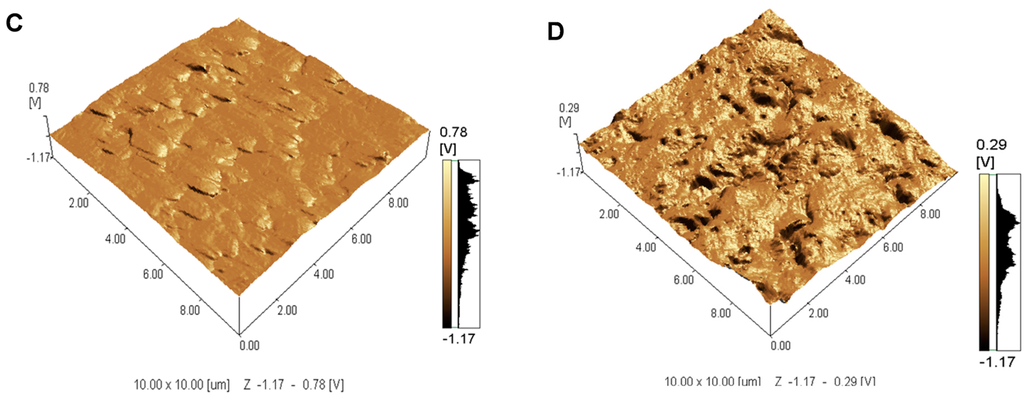 Representative three-dimensional AFM images of the leaf midribs (A,B) and latex (C,D) of healthy (A,C) and PMeV-infected papaya plants (B,D). The microstructures of the healthy leaf midribs and latex (A,C) show smooth surfaces, whereas the infected leaf midribs and latex have rough surfaces (B,D).