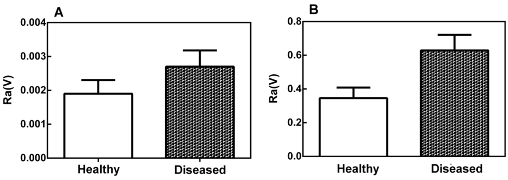 Structural roughness parameter Ra of the leaf midribs (A) and latex (B) of healthy and diseased papaya plants. The roughness (Ra) is the arithmetic mean of the deviations in the profile curve with respect to the midline of the basic length. The error bars represent the variations between biological replicates. The difference between the means is statistically significant (Mann–Whitney test, p < 0.05).