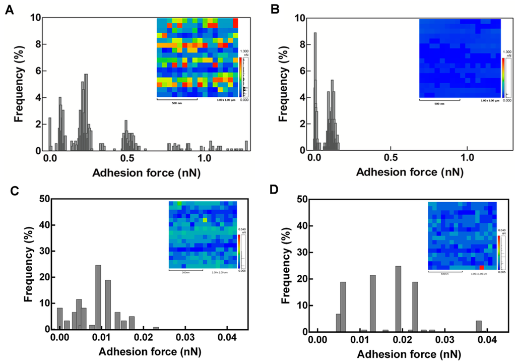 AFM maps and histograms of the adhesion force between the tip and the sample surface of the leaf midribs (A,B) and latex (C,D) of healthy (A,C) and diseased papaya plants (B,D). The vertical axis shows the frequency of the adhesion force in a 1000-nm lateral scan of 256 force curves, and the insets are the corresponding force maps.