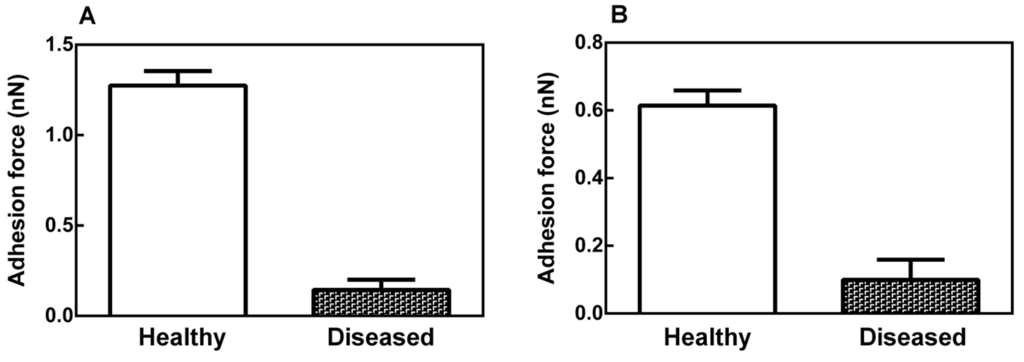 The average adhesion force values of the healthy and diseased plants were 1.25 ± 0.05 and 0.15 ± 0.05, respectively (Figure 5).