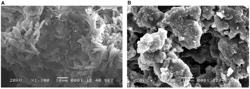Scanning electron microscopy (SEM) images of the latex from healthy (A) and PMeV-infected papaya fruits (B). The samples of healthy plants’ latex shows more united and compact latex particles than those from infected plants, which appeared relatively sparse.