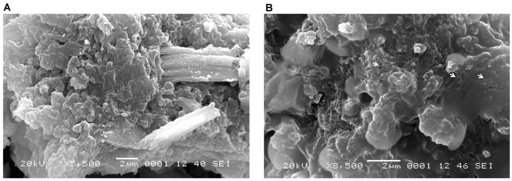 High-magnification SEM images of the latex of (A) healthy and (B) and PMeV-infected papaya fruits. In the infected latex small circles ranging from 40 to 50 nm, alterations in the structure of the latex and possible latex degradation are evident; these alterations were not observed in healthy latex.