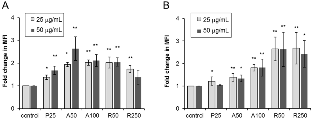 2.3. Effects of Exposure on Accumulation of Reactive Oxygen Species (ROS)