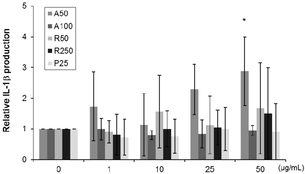 - Morishige, T.; Yoshioka, Y.; Tanabe, A.; Yao, X.; Tsunoda, S.; Tsutsumi, Y.; Mukai, Y.; Okada, N.; Nakagawa, S. Titanium dioxide induces different levels of IL-1β production dependent on its particle characteristics through caspase-1 activation mediated by reactive oxygen species and cathepsin B. Biochem. Biophys. Res. Commun. 2010, 392, 160–165. [Google Scholar] [CrossRef] [PubMed]