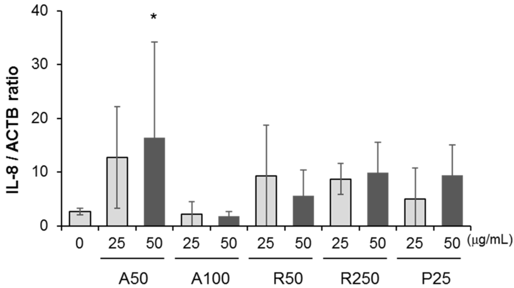 2.5. Effects of Exposure on Expression of IL-8 in Colorectal Adenocarcinoma (Caco-2) Cells
