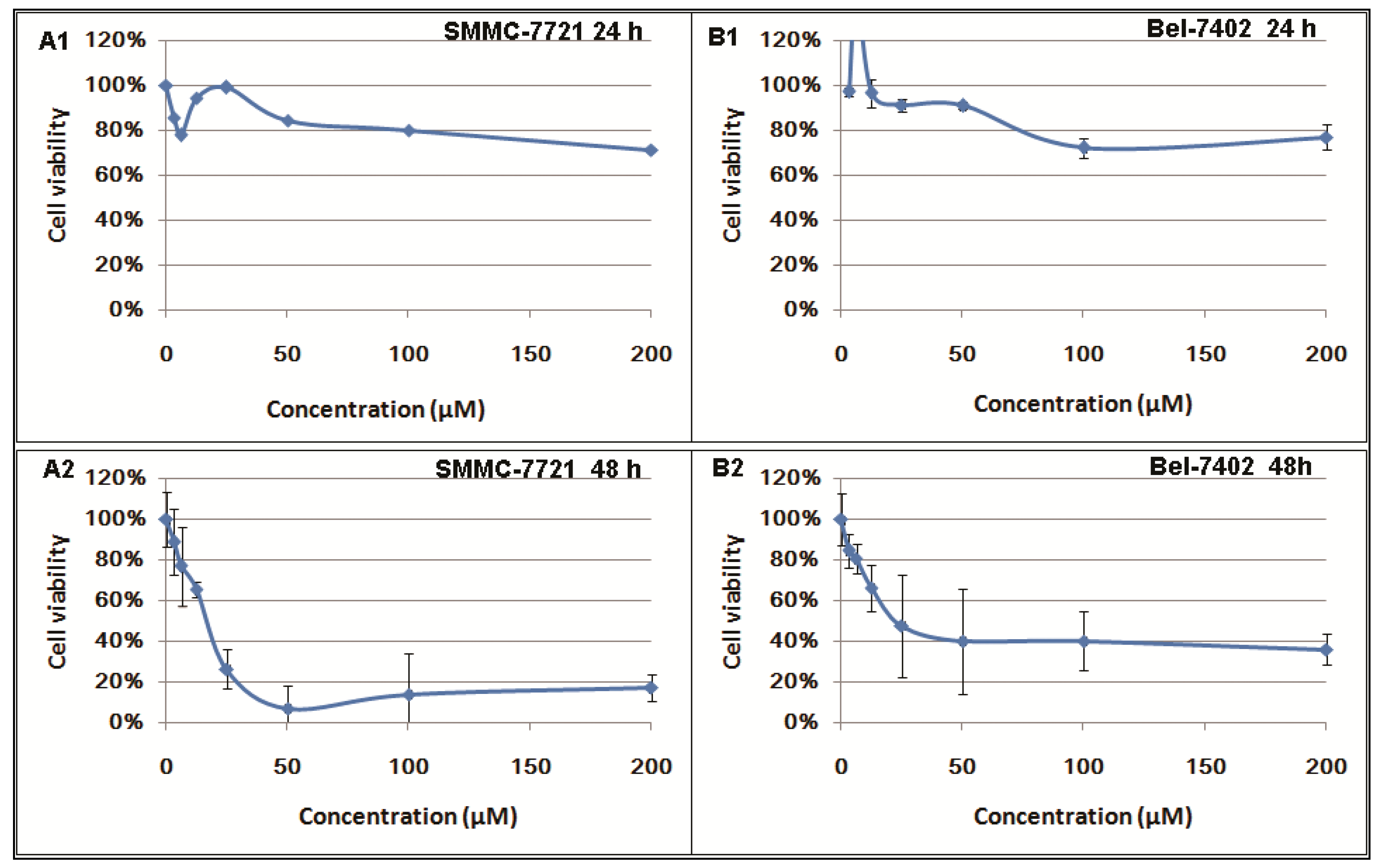 Inhibitory effects of berberine (BBR) on hepatocellular carcinoma (HCC) cells for 24, 48 and 72 h by MTT assay. SMMC-7721 cells were treated with different concentration of BBR (from 0 to 200 μM) for 24 (A1), 48 (A2) and 72 h (A3). Cell viability was detected and calculated; Bel-7402 cells were treated with different concentration of BBR (from 0 to 200 μM) for 24 (B1), 48 (B2) and 72 h (B3). Cell viability was detected and calculated.