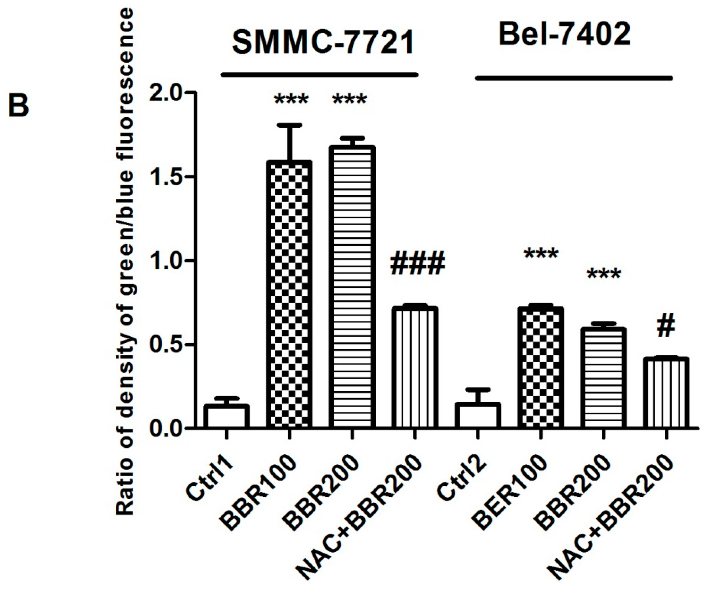 Increased reactive oxygen species (ROS) level in the high concentration of BBR-treated HCC cells by fluorescent microscopy. SMMC-7721 and Bel-7402 cells were incubated in 6-well plates and treated with BBR (100 and 200 μM) for 6 h. 2,7-dichlorodihydrofluorescein diacetate (DCFDA) and Hoechst33258 were used for detecting intracellular ROS level by fluorescent microscopy. Pretreatment of 5 mM of N-Acetyl-l-cysteine (NAC) was added as a negative control. (A) ROS level was observed by fluorescent microscopy. D: DCFDA (green fluorescence); H: Hoechst33258 (blue fluorescence); M: merge; (B) ROS level was calculated by ImageJ 1.38x software (NIH, USA). *** p < 0.001 (vs. the control group); # p < 0.05 (vs. BBR200 group); ### p < 0.001 (vs. BBR200 group).
