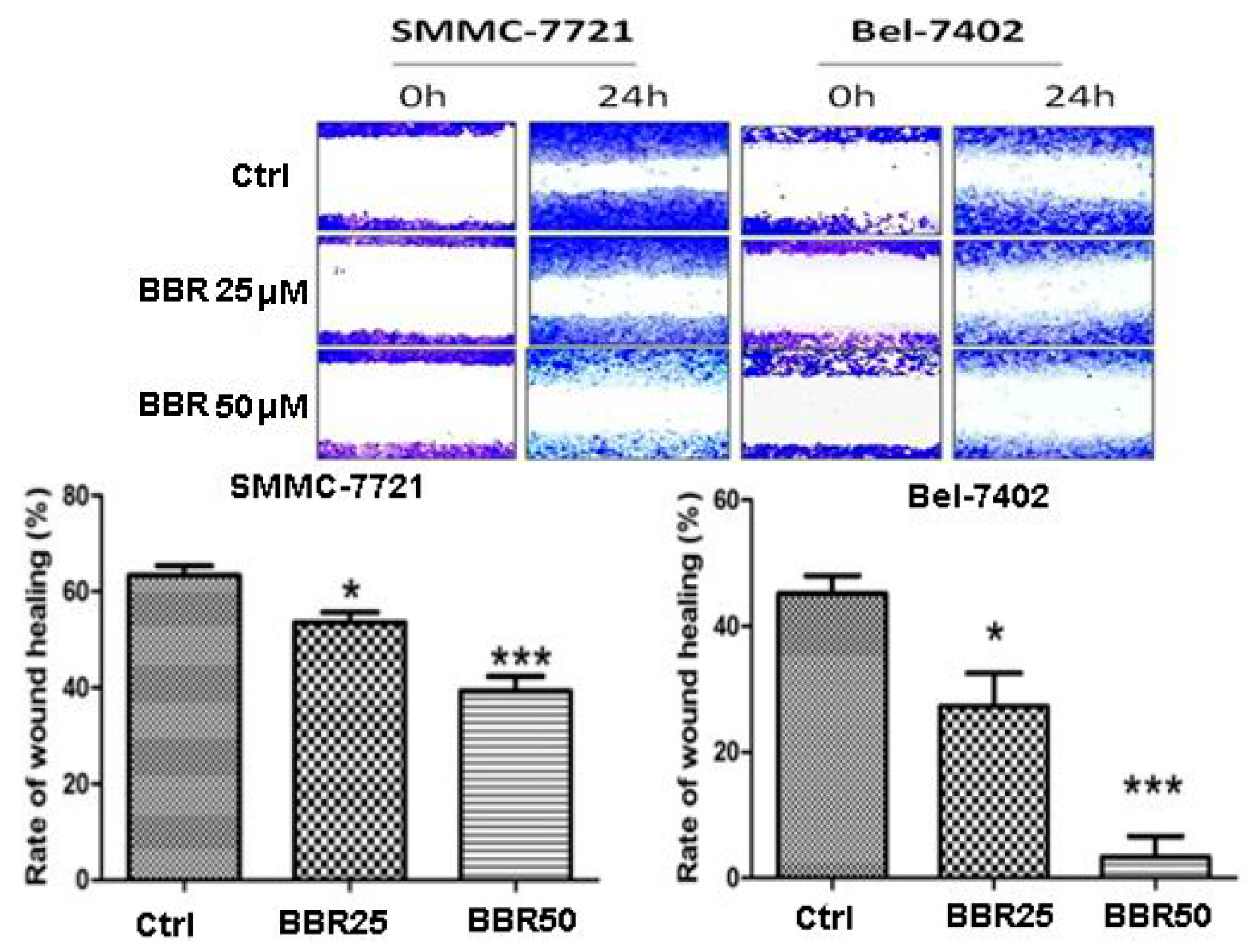 Decreased migration of BBR-treated HCC Cells by wound healing assay. SMMC-7721 and Bel-7402 cells were incubated in 12-well plates with wound healing assay inserts. BBR (25 and 50 μM) was added for 24 h. The cells were stained by violet crystal and the rate of wound healing was observed and calculated. * p < 0.05 (vs. the control group); *** p < 0.001(vs. the control group).