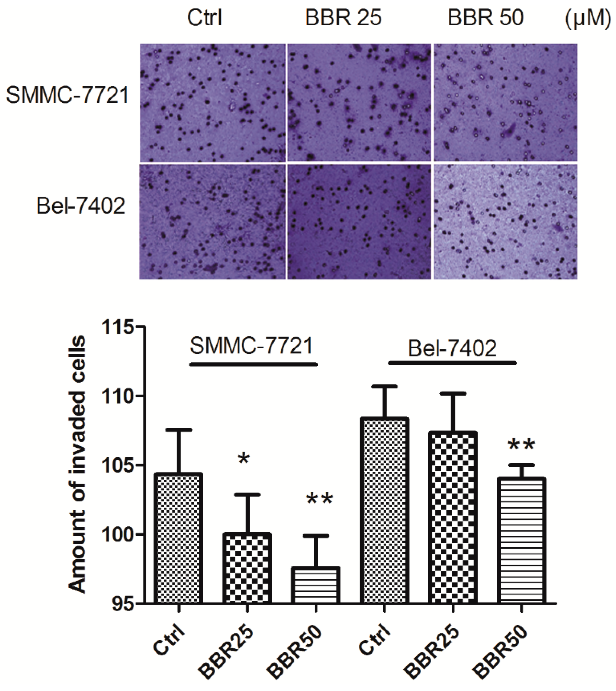 Decreased invasion of BBR-treated HCC cells by transwell test.Matrigel was coated on the transwell membranes. SMMC-7721 and Bel-7402 cells were diluted by 0.2% BSA-containing media in the upper of transwell. Media with BBR (25 and 50 μM) were added as attractants in the receiver wells. After 24 h, the invasive cells were calculated by violet crystal staining. * p < 0.05 (vs. the control group); ** p < 0.01(vs. the control group).
