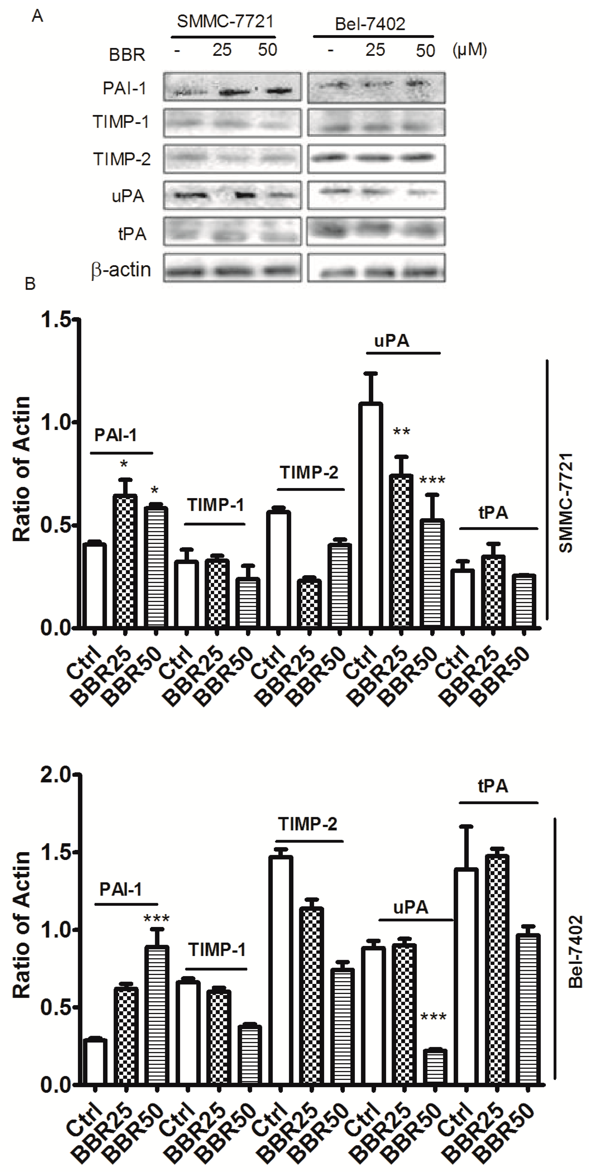 Induction of plasminogen activator inhibitor-1 (PAI-1) and inhibition of urokinase-type plasminogen activator (uPA) in BBR-treated HCC cells by western blot. SMMC-7721 and Bel-7402 cells were treated with BBR for 6 h. Proteins were collected, determined and expression of PAI-1, TIMP-1, TIMP-2, uPA and tissue-type plasminogen activator (tPA) were analyzed by western blot. β-actin was used as internal standard. (A) Protein expression was observed by ChemiDoc™ XRS+ Molecular Imager; (B) Protein expression was calculated by ImageJ 1.38x software. * p < 0.05 (vs. the control group); ** p < 0.01 (vs. the control group); *** p < 0.001 (vs. the control group).