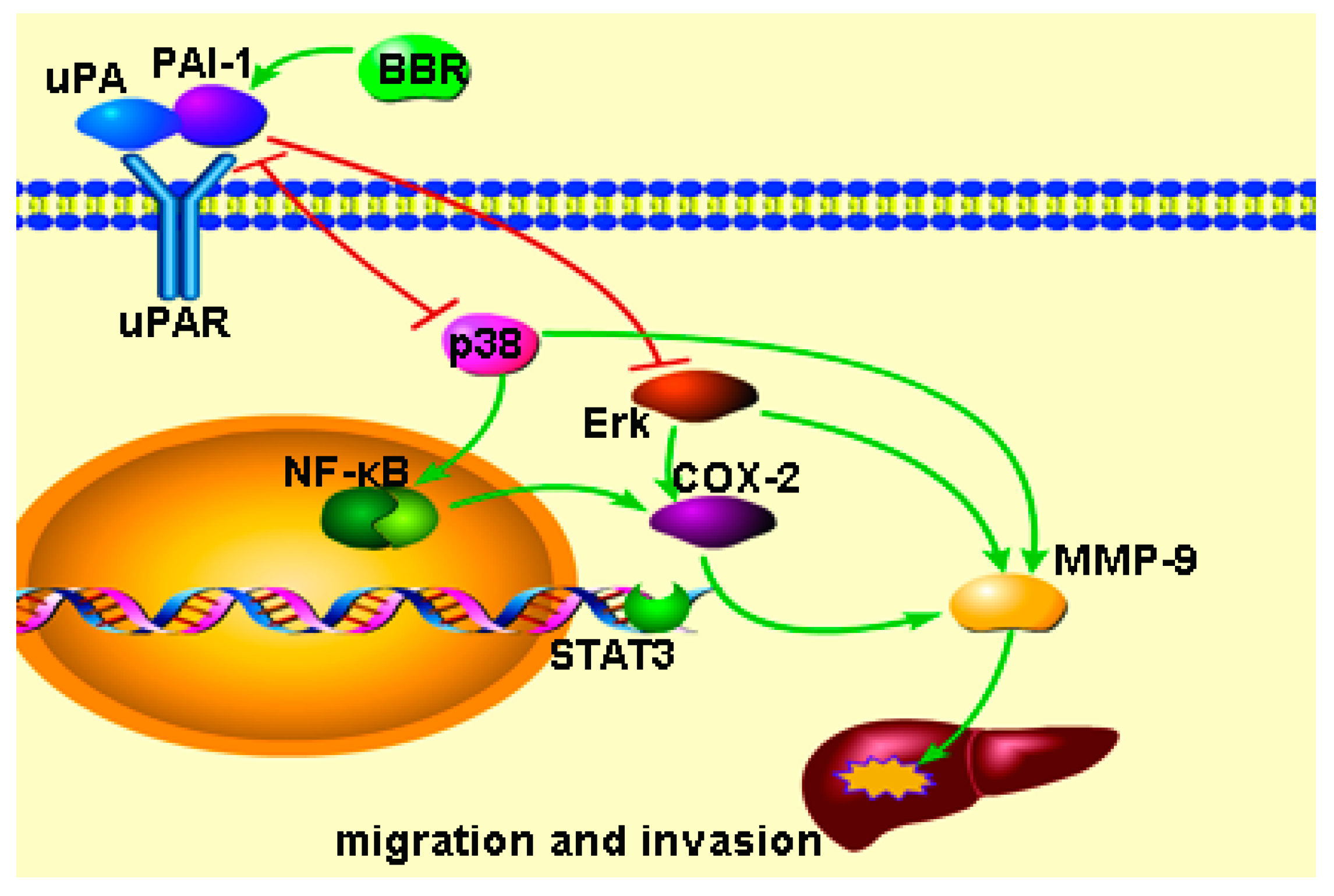 A body of evidence emphasizes that inflammation responses participate the different stages of cancer, including initiation, promotion, malignant conversion, invasion, and metastasis [20]. COX-2 can produce prostaglandins (PGs), which then contributes to cancer invasion and metastasis [37]. Of note, COX-2 is a one of the downstream genes of NF-κB, whose inactivation may consequently lead to inhibition of COX-2-induced cell invasion and migration [41,42]. On the other hand, MMPs were up-regulated by uPA and tPA and down-regulated by TIMPs and PAI-1. Both inhibiting uPA and tPA and activating PAI-1 and TIMPs can inhibit migration and invasion [39]. Our data in this study showed the expression of NF-κB, COX-2 and MMP-9 was suppressed upon berberine treatment, indicating that the anti-invasive effect of berberine may be associated with inflammation response of cancer cells upon treatment. Furthermore, berberine was found to inactivate p38 and Erk1/2 pathways, both of which belong to MAPK signaling pathway family. Studies showed that MAPK signaling pathways regulate a number of cancer cell behavior including migration and invasion [43]. MAPKs are downstream of several inflammation-associated receptors such as toll-like receptor 4 (TLR4) and uPA receptor (uPAR) [22,44,45]. In this study, the results indicated that BBR induced PAI-1 and inactivated p38 and Erk1/2 which may involve in inhibition of cancer cell migration and invasion. In particular, we found that berberine can induce expression of PAI-1, an important of antagonist of both TLR4 and uPAR. This means induction of PAI-1 may be involved in inactivation of p38 and Erk1/2 by BBR. In addition, HMGB1, another important inflammation factor, may involve cell migration and invasion by TRL4 [46]. HMGB1 may interact with PAI-1 which also participates TRL4 signaling pathway [44], thus we investigated if HMGB1 involved in BBR-induced PAI-1. However, the results showed there was no significantly change of HMGB1 in this study. Interestingly, decrease of uPA was observed in berberine-treated HCC cells. Evidence shows that uPAR overexpression can selectively induce the expression of active uPA by a feedback loop, and uPAR overexpression induces the activation of ERKs and p-38 MAPKs [47]. Taking together, these findings indicate that up-regulation of PAI-1 and down-regulation of uPA by berberine may inactivate uPAR and its downstream signaling, which in turn suppresses inflammation-associated migration and invasion of HCC cells. The regulatory scheme of berberine on PAI-1/uPA-associated pathway was shown in Figure 8.