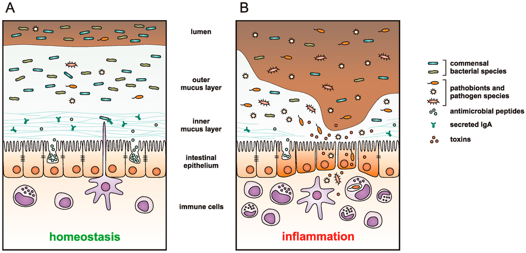 A schematic representation of intestinal mucosa in (A) healthy; and (B) inflammatory bowel disease (IBD)-affected individual. A thick mucus layer overlies the entire epithelium of the healthy intestine. Bacteria are distributed throughout the outer mucus layer, while the inner layer is thick and resistant to bacterial penetration due to the antimicrobial peptides secreted by the epithelial cells, and immunoglobulin A (IgA) produced by B cells and transcytosed across the epithelial layer. Commensal microbiota suppresses the proliferation of pathobionts (opportunistic bacteria that coexist with commensals in low extent) and enteric pathogens, tuning the host responses towards immunological tolerance and maintaining intestinal homeostasis. Genetic and environmental factors influence intestinal microbiota composition and can lead to mucosal dysbiosis—disruption of commensal microbial community, resulting in outgrowth of pathobionts and colonization of the intestine by pathogen species. These bacterial species produce and secrete toxins, thinning the protective mucus layer, damaging the epithelial layer and, thus, reducing the integrity of the epithelial barrier. The bacteria can gain access to epithelium and mucosal tissue resulting in a strong inflammatory response by the host immune system.
