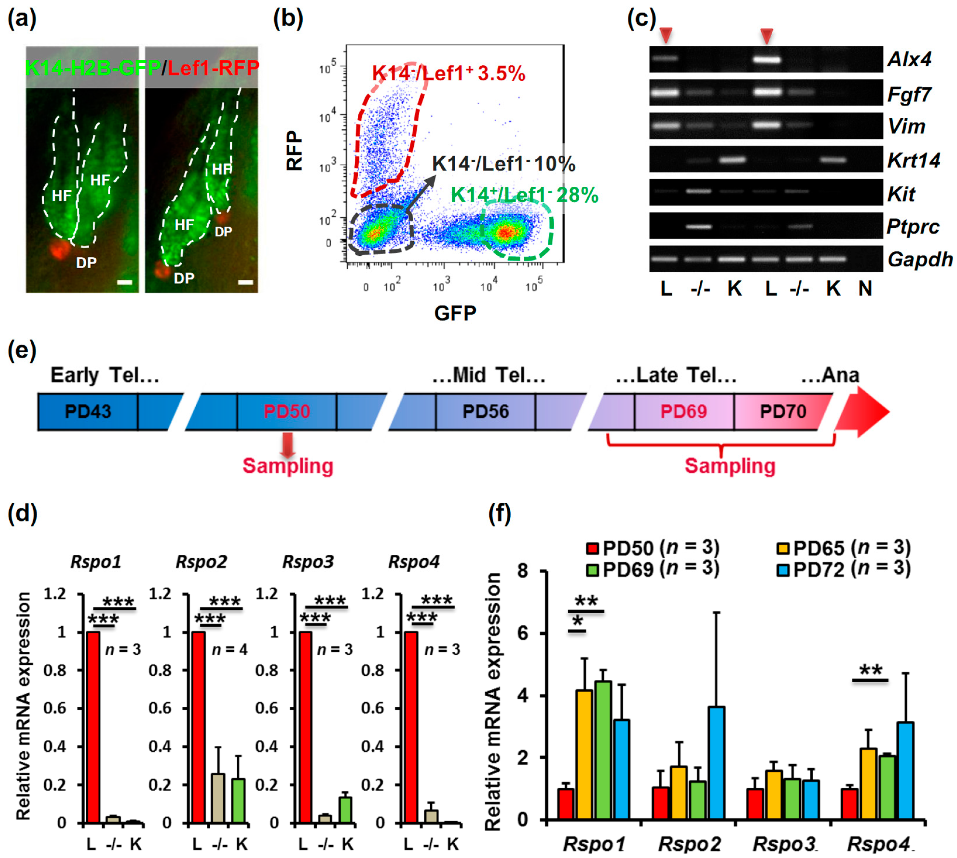 Expression of R-spondin genes in the mouse dorsal skin. (a) Hair follicles in the back skin of a K14-H2B-GFP/Lef1-RFP mouse; (b) isolation of different cell populations from the dorsal skin of K14-H2B-GFP/Lef1-RFP mice using FACS; (c) RT-PCR results showing the expression of different marker genes in the K14−/Lef1+ (L), K14−/Lef1− (−/−) and K14+/Lef1− (K) cell populations from two independent mice. H2O was used instead of cDNA as a negative control (N) and Gapdh was used as an internal control. The arrows indicate the track of K14−/Lef1+ (L) group; (d) qPCR results showing the relative expression of the four R-spondin genes in the K14−/Lef1+ (L), K14−/Lef1− (−/−) and K14+/Lef1− (K) cell populations; (e) sampling schedule for the FACS assay; and (f) relative expression of R-spondin genes in the DP in different periods of telogen. HF, hair follicle; DP, dermal papilla; Tel, telogen; Ana, anagen; PD, postnatal day. Bar = 50 μm. * p < 0.05; ** p < 0.01; *** p < 0.001.