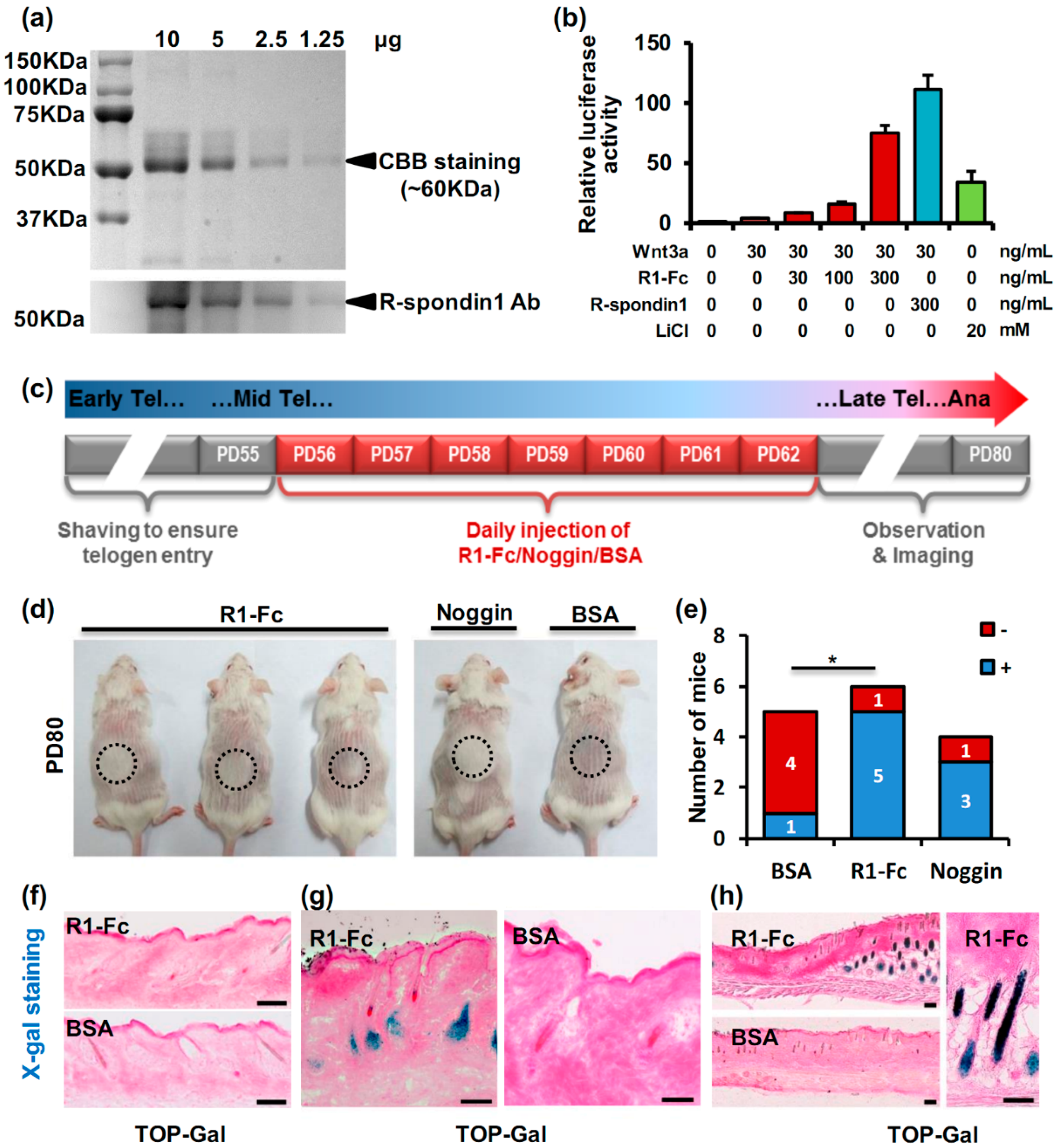 Exogenous R-spondin1 injection leads to precocious anagen entry. (a) Coomassie blue staining and immunoblotting of R-spondin1-Fc protein purified from the R-spondin1-293T cells; (b) TCF luciferase assay showing the bioactivity of the R-spondin1-Fc protein; (c) schedule for R-spondin1 injection assay; (d) pictures of mice injected with R-spondin1-Fc, Noggin or BSA (negative control) on PD80. Dotted circles show the injection site; (e) statistical analysis of the protein injection assay. Mice with precocious hair regrowth was regarded as + and the opposite as −; (f) X-gal staining in dorsal skin of TOP-Gal mice on PD55; (g) X-gal staining of dorsal skin of TOP-Gal mice injected with R-spondin1-Fc or BSA one week after the initial injection; an (h) X-gal staining of dorsal skin of TOP-Gal mice injected with R-spondin1-Fc or BSA about three weeks after the initial injection. CBB, Coomassie blue; R1-Fc, R-spondin1-Fc; PD, postnatal day; BSA, bovine serum albumin; Tel, telogen; Ana, anagen. Bar = 100 μm in (f,g). * p < 0.05.