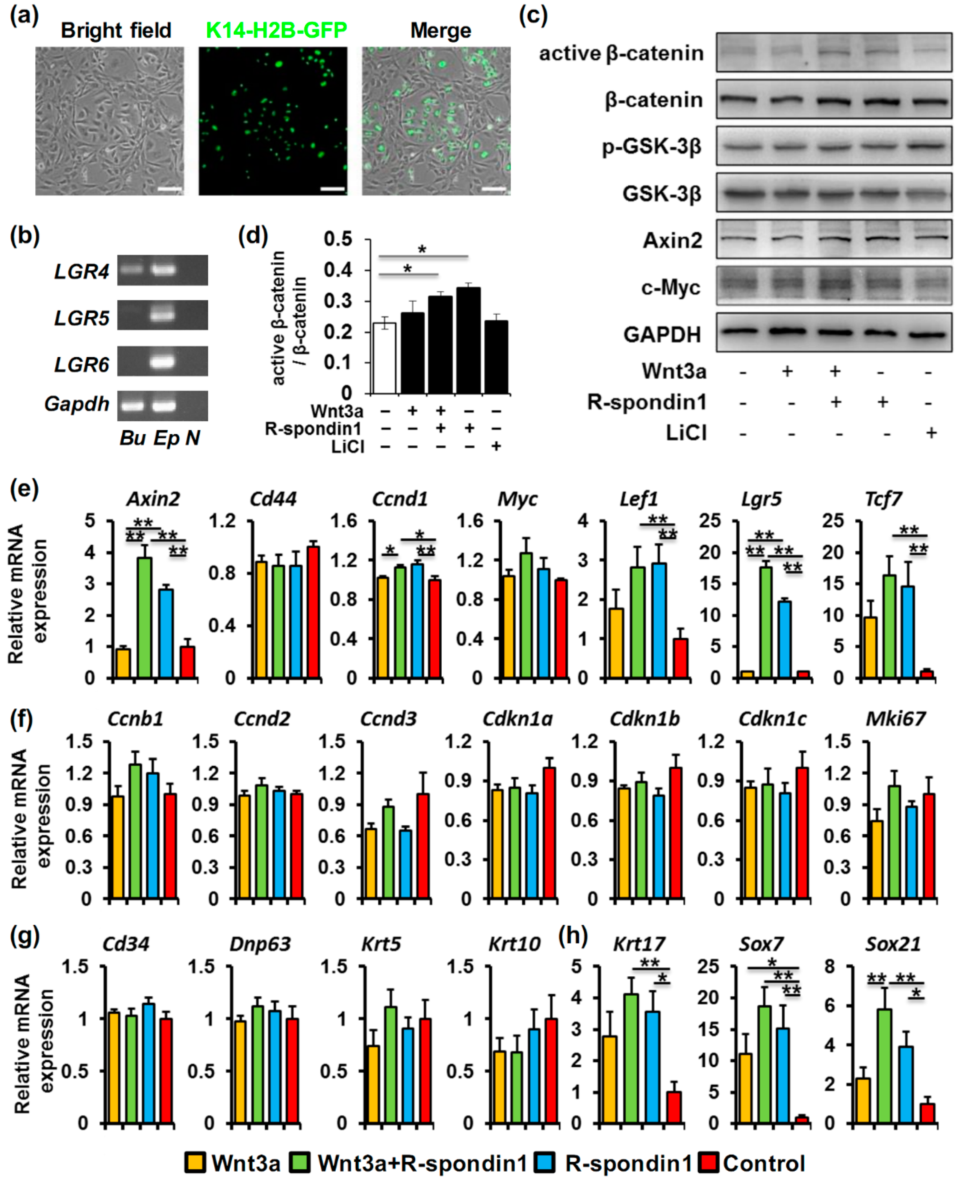 R-spondin1 activates Wnt/β-catenin signaling in bulge stem cells in vitro. (a) Morphology and green fluorescence of K14-H2B-GFP bulge stem cells in culture. The non-GFP cells were NIH-3T3 feeder cells; (b) RT-PCR showing the expression of Lgr4/5/6 in the cultured bulge stem cells (Bu). Mouse epidermal cells (Ep) were used as a positive control and H2O was used as a negative control (N); (c) Western blotting showing the activation of Wnt/β-catenin in bulge stem cells treated with LiCl, Wnt3a or/and R-spondin1. GAPDH was used as a loading control; (d) densitometric analysis of active β-catenin/β-catenin in Figure 3c. Three independent experiments were performed for quantification; (e–h) qPCR results showing relative expression of Wnt/β-catenin target genes (e); cell cycle-related genes (f); genes associated with HFSC differentiation (g) and fate determination (h) in bulge stem cells treated with Wnt3a or/and R-spondin1. Bar = 100 μm. * p < 0.05; ** p < 0.01.