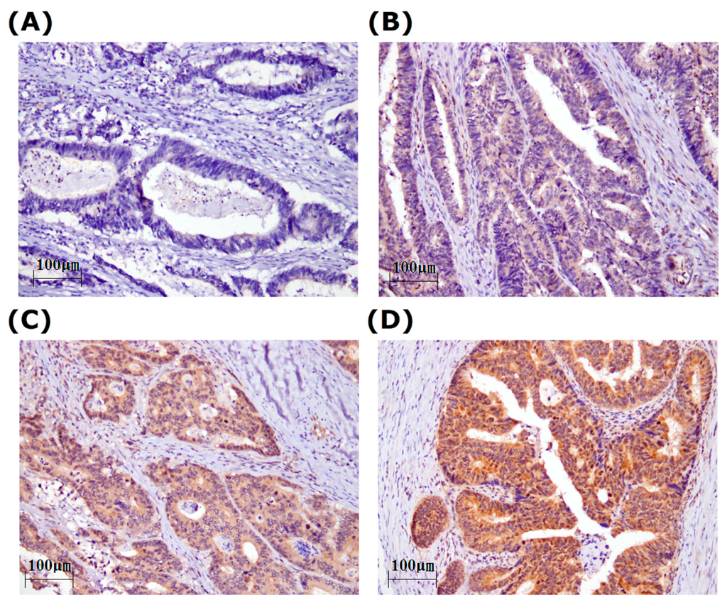 Representative immunostaining of STEAP1 in colorectal cancer in tissue arrays. STEAP1 expression scores were (A) 0; (B) 100; (C) 200; (D) 300.
