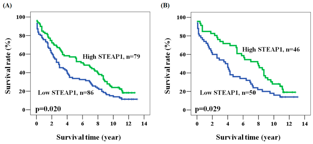 We verified a prognostic role for STEAP1 expression in colorectal cancer by collecting overall survival data from 165 patients. The mean and median follow-up times after surgery were 5.4 and 3.9 years (ranging from 0.1 to 13.1 years), respectively. During the 13 years of follow-up in this survey, 139 (84.2%) patients died and the five-year survival rate was 44.8%. We used the Cox regression model to evaluate the prognostic role of age, gender, stage, and STEAP1 expression in colorectal cancer patients. Among the clinicopathological characteristics, late stage (stage II + III + IV) was significantly associated with poor clinical outcome (hazard ratio (HR) = 1.797, 95% confidence interval (CI) = 1.079–2.992, p = 0.024 for univariate analysis; HR = 1.851, 95% CI = 1.111–3.085, p = 0.018 for multivariate analysis, Table 2 and Table 3). Overall survival was shorter for patients with late stage than with early stage cancer (five-year survival: 40.1% vs. 73.9%, stage II + III + IV vs. I, p = 0.024). However, age and gender showed no significant association with patient prognosis (Table 2 and Table 3). Interestingly, prognosis was significantly poorer in patients with low STEAP1 expression than with high STEAP1 expression (HR = 1.477, 95% CI = 1.056–2.066, p = 0.023 for univariate analysis; HR = 1.500, 95% CI = 1.071–2.100, p = 0.018 for multivariate analysis; five-year survival: 33.7% vs. 57.0%, low STEAP1 vs. high STEAP1, p = 0.020, Table 2 and Table 3, and Figure 2A). We also investigated the influence of tumor grade and histology on the prognostic role of STEAP1 by further adjusting for tumor grade, histology, age, gender, and stage. The adjusted results confirmed that low STEAP1 expression still predicted poor prognosis (HR = 1.592, 95% CI = 1.126–2.251, p = 0.009 for multivariate analysis). These findings suggested a more favorable prognosis for colorectal cancer patients with high STEAP1 expression.