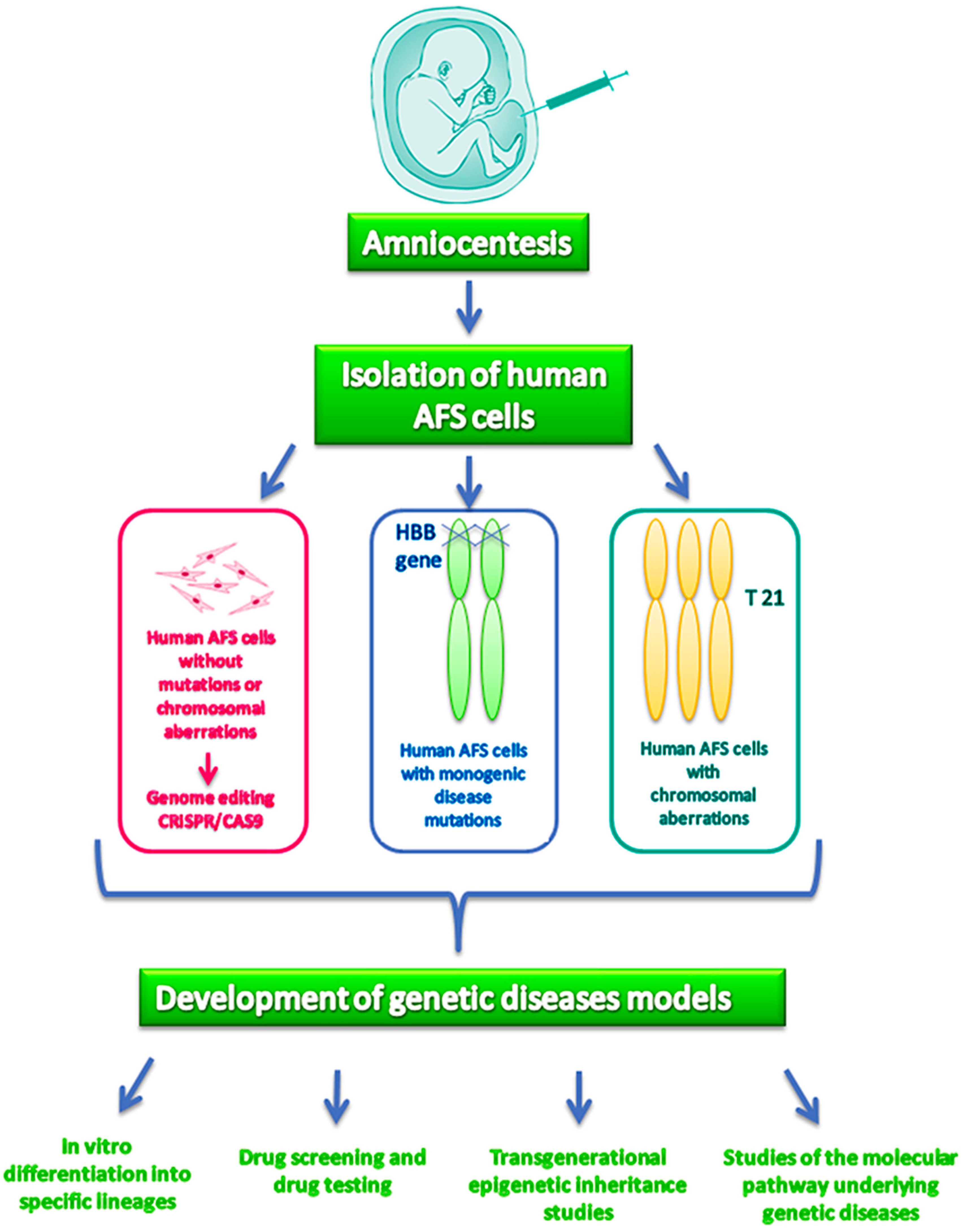 A few examples of this possibility have already been reported in the literature. Fan and colleagues, in 2012 [57], generated β-thalassemia homozygous iPS cells both from AFS cells and from skin fibroblasts using a doxycycline-inducible lentiviral system to compare the efficiency of both cellular models. Interestingly, the obtained results demonstrate that human β-thalassemia iPS can be more rapidly and efficiently generated from AFS cells than from adult skin cells, opening up the possibility of testing mutation-specific drugs that could be used for the early perinatal treatment of the affected newborn. AF-iPS have also been generated from human second trimester fetuses with trisomy 21 obtaining an in vitro model of Down syndrome allowing the modeling of the neurogenesis in AF-iPS with trisomy 21 and highlighting the role of miR-155 and miR-802, both encoded by chromosome 21, in the impairment of neuronal differentiation [28,60]. Moreover, trisomy 21 AF-iPS cells showed a significantly lower efficiency in neuronal differentiation than normal AF-iPS, suggesting that the overexpression of APP is a factor leading to impairments during neurogenesis. In light of these premises, AFS cells represent a promising tool to model in vitro pathogenic phenotypes, and the establishment and banking of clonal AFS cell lines derived from pregnancies with specific genetic aberrations would be of highest value for basic research and drug discovery [61] (Figure 1). However, a limitation in this approach is that gene modeling by AFS cells would involve only genetic diseases currently investigated in prenatal diagnosis, such as chromosomal abnormalities or monogenic disease in at risk families, but not multifactorial disease or late onset monogenic diseases. However, in recent times, the emerging technology for genome editing, also known as CRISPR (Clustered Regularly Interspaced Short Palindromic Repeats)/Cas9 system, has allowed the generation of disease models for both monogenic and complex genetic disorders, enabling creation of knockout cells in vitro. Preliminary results of our group suggest that AFS cells are capable of generating human cellular disease models in vitro by CRISPR/Cas9 system with great speed and efficiency (data not shown).