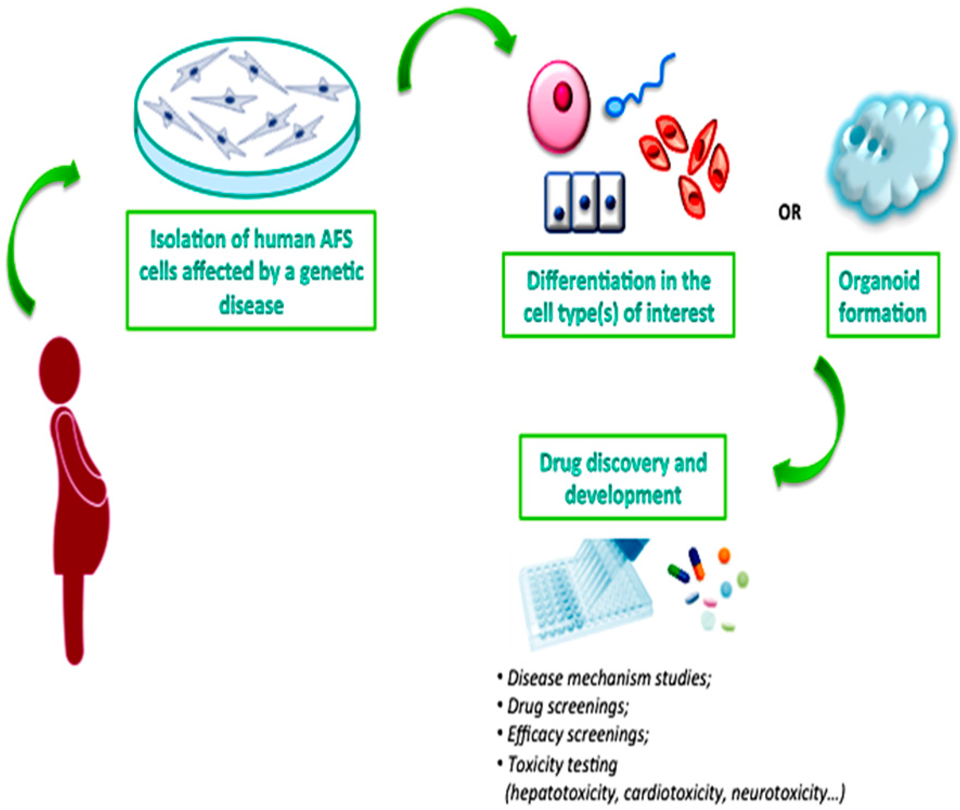 In conclusion, AFS cells, with their potential large-scale amplification, differentiation and 3D organoid formation, could represent a very interesting source to produce physiologically-relevant novel systems to adequately test pharmaceutical agents before their administration to patients, although additional experimental data that confirms this hypothesis is still required (Figure 2).