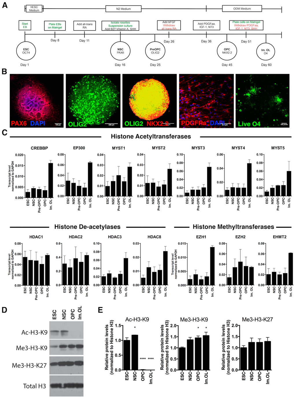 Expression pattern of histone modifiers and relative histone marks during oligodendrocyte differentiation of ESCs. (A) Diagram depicting the major steps of oligodendrocyte differentiation with the corresponding cellular markers that peak at different days of differentiation. In green are described the technical procedures and in red the reagent withdrawal. ESC: embryonic stem cell; EB: embryoid body; NSC: neural stem cell; OPC: oligodendrocyte progenitor cell; Im. OL: immature oligodendrocyte; (B) Representative images showing immunofluorescent detection of oligodendrocyte-lineage markers during differentiation. From left to right: PAX6 in rosette-like structures, OLIG2 in free-floating spheroids, coexpression of OLIG2 and NKX2.2 in free-floating spheroids, PDGFRα in single cells after trituration of spheroids, live O4 staining in single cells; scale bars: 100 µm; (C) Transcriptional levels of histone acetyltransferases, deacetylases and methyltransferases during oligodendrocyte differentiation. The bars are the mean ± SEM relative to GAPDH; (D) Western blot analysis of specific epigenetic marks on H3 at different days of differentiation; (E) Quantification of Western blots was performed by determining the relative expression level of (from left to right) Ac-H3-K9, Me3-H9-K9 and Me3-H9-K27 relative to histone H3. Data were normalized to ESC, and results are expressed as the mean ± SEM (* p < 0.05; **** p < 0.0001).
