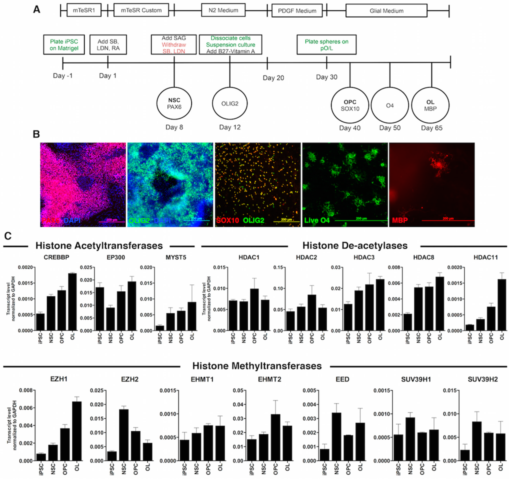 Transcriptional profile of histone modifiers during differentiation of human induced pluripotent stem cells (iPSCs) into oligodendrocytes. (A) Schematic representation of the oligodendrocyte differentiation protocol, including oligodendrocyte lineage markers along the differentiation. In green are described the technical procedures and in red the reagent withdrawal; (B) Representative images depicting the most important oligodendrocyte lineage markers after immunofluorescent labeling. From left to right: PAX6, OLIG2 in the 3D structures, SOX10 and OLIG2 staining in cells growing out of the plated aggregates, live O4 staining of cells migrating out of the spheres, myelin basic protein (MBP) staining of oligodendrocytes at the end of the differentiation; scale bars: 200 µm; (C) Quantitative RT-PCR showed differences in the transcript levels of enzymes responsible for acetylation, deacetylation and methylation during oligodendrocyte lineage commitment. The bars are the mean ± SEM, relative to GAPDH levels.