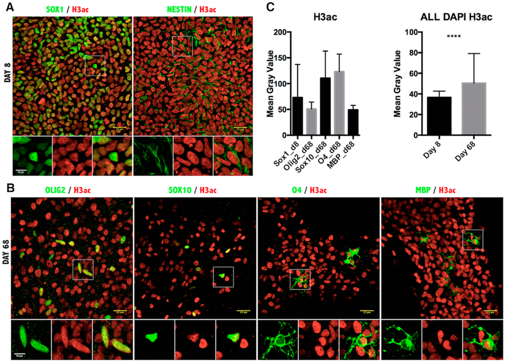 Immunofluorescence analysis of histone H3 pan-acetylation in iPSC-derived oligodendrocyte lineage cells. (A) Representative images of Day 8 of the oligodendrocyte differentiation protocol co-stained for NSC markers SOX1, NESTIN and the pan-acetylated histone 3 antibody; (B) Images from Day 68 of differentiation co-stained for oligodendrocyte markers OLIG2, SOX10, O4, MBP and H3ac antibody. Scale bar = 25 μm. The magnified view of the broken line box area appears as the inset with the individual channels and the merged image. Scale bar = 10 μm; (C) Quantitation of the immunofluorescence signal as the mean gray value in cells expressing the indicated markers (left) or in all DAPI-positive cells per field (right). Results are represented as the mean with the SD. **** p < 0.0001.