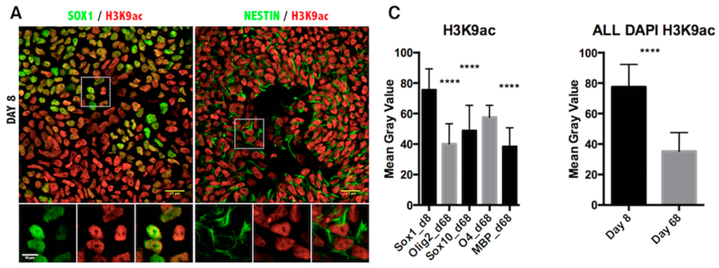 Immunofluorescence analysis of histone H3 lysine 9 acetylation in iPSC-derived oligodendrocyte lineage cells. (A) Representative images of Day 8 of the oligodendrocyte differentiation protocol co-stained for NSC markers SOX1, NESTIN and the H3K9ac antibody; (B) Images from Day 68 of differentiation co-stained for oligodendrocyte markers OLIG2, SOX10, O4, MBP and H3K9ac antibody. Scale bar = 25 μm. The magnified view of the broken line box area appears as the inset with the individual channels and the merged image. Scale bar = 10 μm; (C) Quantitation of the immunofluorescence signal as the mean gray value in cells expressing the indicated markers (left) or in all DAPI-positive cells per field (right). Results are represented as the mean with the SD. **** p < 0.0001.