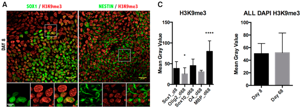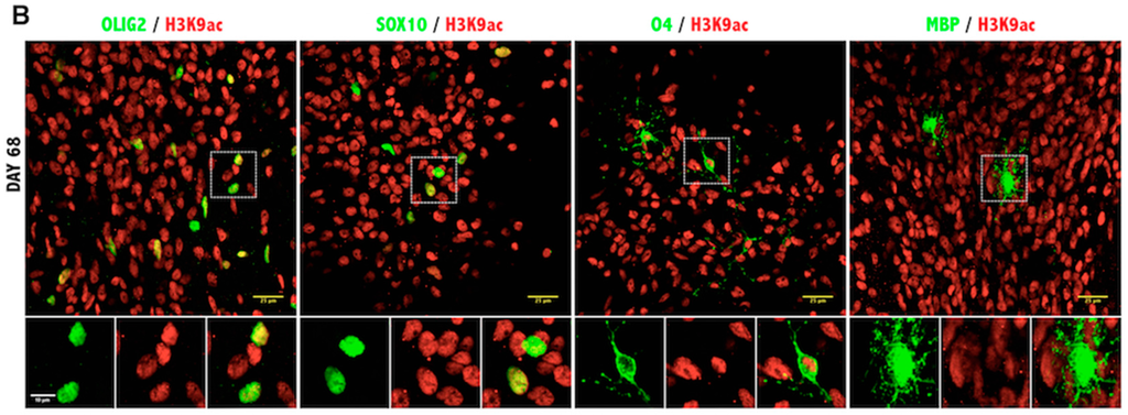 It is widely accepted that histone-specific marks, even at specific residues of a single histone protein, can be associated with multiple enzymes. Although there may be variability in the levels of histone modification enzymes, the end result is the deposition or removal of the specific repressive or activating mark on the histone residues. The fluctuation of transcript levels of enzymes and their kinetics in our qPCR data can probably be explained by the redundancy and/or cell specificity of these enzymes. Furthermore, this apparent discrepancy in the upregulation of both HATs and HDACs (Figure 1C and Figure 2C) could also reflect the existence of alternative mechanisms of activation. It should be noted that the qRT-PCR technique is performed with mRNA isolated from entire cultures and not from purified cell-types, therefore containing contaminant cells, such as neurons and astrocytes. Indeed, in our panel of immunofluorescent images, only a fraction of the total population expressed the OLIG2 marker. Therefore, the definite answer for the epigenetic status of the chromatin should come from the in situ identification of the end product, that is the H3ac on the oligodendrocyte lineage cells. The immunofluorescent staining revealed that acetylation of H3K9 was significantly reduced during oligodendrocyte differentiation of iPSCs (Figure 4C), and a similar conclusion could be drawn from the Western blot analysis during ESC differentiation (Figure 1D,E). The removal of the acetyl group from this lysine residue is critical for the deposition of the repressive methylation mark, and in agreement with this determination, H3K9me3 was found to be specifically increased in the MBP-expressing oligodendrocytes (Figure 5C). The other repressive mark, H3K27me3, was significantly increased in the MBP+ oligodendrocytes (Figure 6C, left panel), as well as in the total number of cells (DAPI+) at Day 68 of differentiation (Figure 6C, right panel). However, H3K27me3 was not significantly increased when only the OLIG2 population was scored; this could have been related to the heterogeneous composition of the OLIG2+ population, which includes OPCs, Im. OL and mature oligodendrocytes, as this marker is present at all developmental stages of oligodendrogenesis. Because H3K9me3 is associated with repressive heterochromatin formation, it is important that its nuclear localization changes over the course of differentiation, starting with punctate staining patterns (Figure 5A), presumably representing small heterochromatic foci, and then spreading throughout the nucleus as heterochromatin occupies the majority of the differentiated OL nuclei (Figure 5B) [27].