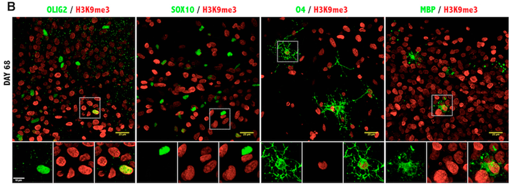 OPCs are the myelinating cells of the central nervous system (CNS). They differentiate into highly arborized oligodendrocytes, expressing myelin-specific proteins and reaching out with their processes to proximal nerve fibers. Recognition and contact with axonal targets induce the synthesis of lipid-rich lamellae of myelin and wrapping of segments of axons into a compact multilayer spiral. This creates a highly specialized insulation that allows for the fast and efficient transmission of electrical signals [8]. The importance of myelin is evident in pathological conditions, such as multiple sclerosis (MS), in which its damage results in slower impulse transmission, more vulnerable axons, functional deficits and eventually irreversible axonal degeneration. Genetic deletion of oligodendrocyte-specific proteins, such as 2′,3′-cyclic nucleotide phosphohydrolase (CNP) in transgenic mice, does not lead to any apparent defect in myelin, but causes profound axonal degeneration in the long-term, manifested through progressive accumulation of neurological symptoms (e.g., convulsions, gait abnormalities, weakness) and ultimately precocious death [9]. These findings suggest that oligodendrocytes and myelin are essential for neuronal health and optimal CNS functioning, and recent evidence highlighted the importance of myelin in cognition, memory and learning of complex skills [10]. Thus, a thorough understanding of the processes leading to the generation of myelinating oligodendrocytes is of high relevance to a vast number of neurological and psychiatric disorders. Most of our knowledge on the processes of oligodendrocyte differentiation and maturation has been extensively investigated, and their major regulators have been identified in rodent models [11,12,13,14,15]. It is now clear that the oligodendrocyte lineage commitment results from subsequent waves of regulation of gene expression that first reduce precursor markers and inhibitory signals and then increase the expression of mature markers. This is achieved by the deposition of specific repressive and activating marks on lysine residues in the tail of histone H3 [11,15,16]. In particular, deacetylation of lysine residues on H3 has been involved in the early repression of transcriptional inhibitors of myelin genes at the progenitor state, as cells stop proliferating and initiate a transcriptional program of differentiation [15,17,18]. The repressive trimethylation of K27 (H3K27me3) by the enzyme EZH2 has been shown by our group and others to critically regulate the repression of neuronal genes during the transition from neural stem cells (NSCs) to OPCs [19], while the deposition of the trimethyl mark on H3K9 (H3K9me3) has been shown to repress the expression of genes modulating the electrical properties of oligodendrocyte progenitors, which need to be silenced during the maturation into electrically-silent myelinating oligodendrocytes [11]. While these studies identified the importance of several epigenetic processes for developmental myelination in rodents, the translation to human cells is fundamental, and this is the goal of this study.