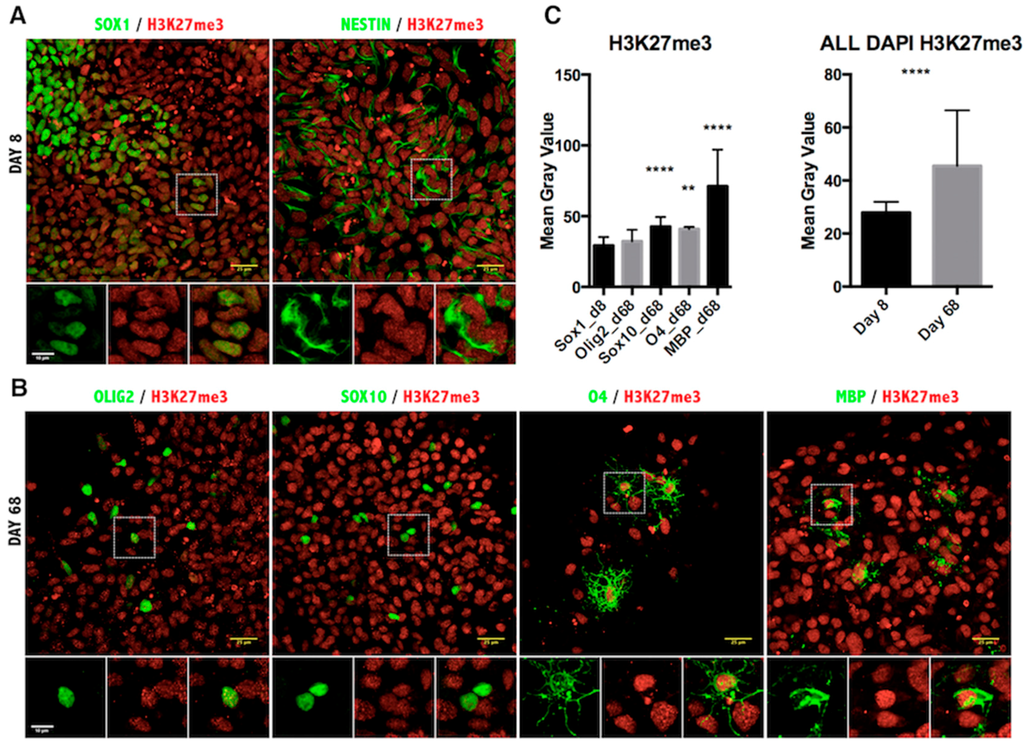 Immunofluorescence analysis of histone H3 lysine 27 trimethylation in iPSC-derived oligodendrocyte lineage cells. (A) Representative images of Day 8 of the oligodendrocyte differentiation protocol co-stained for NSC markers SOX1, NESTIN and the H3K27me3 antibody; (B) Images from Day 68 of differentiation co-stained for oligodendrocyte markers OLIG2, SOX10, O4, MBP and H3K27me3 antibody. Scale bar = 25 μm. The magnified view of the broken line box area appears as the inset with the individual channels and the merged image. Scale bar = 10 μm; (C) Quantitation of the immunofluorescence signal as the mean gray value in cells expressing the indicated markers (left) or in all DAPI-positive cells per field (right). Results are represented as the mean with the SD. ** p < 0.001; **** p < 0.0001.