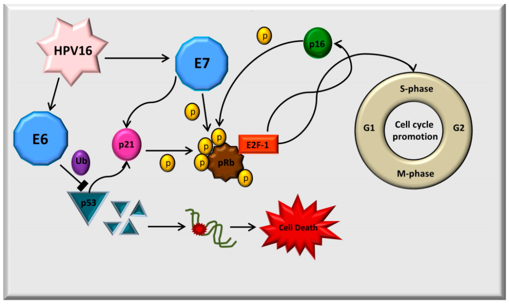 The E6 oncoprotein consists of 158 amino acid residues and contains two zinc-binding domains, similar to the E7 oncoprotein. E6 oncoprotein can join with the p53 tumor suppressor protein and promote its degradation by the cellular ubiquitination, perturbing the control of cell cycle progression and leading to the increased tumor growth. The major role of E6 is the degradation of p53, reducing the cell’s ability to respond to DNA damage (Figure 1). The E6 oncoprotein can also have oncogenic activities independent of p53. Further, the E6 oncoprotein can activate the telomerase enzyme, which is highly functional in human cancers and immortalized cell lines [].