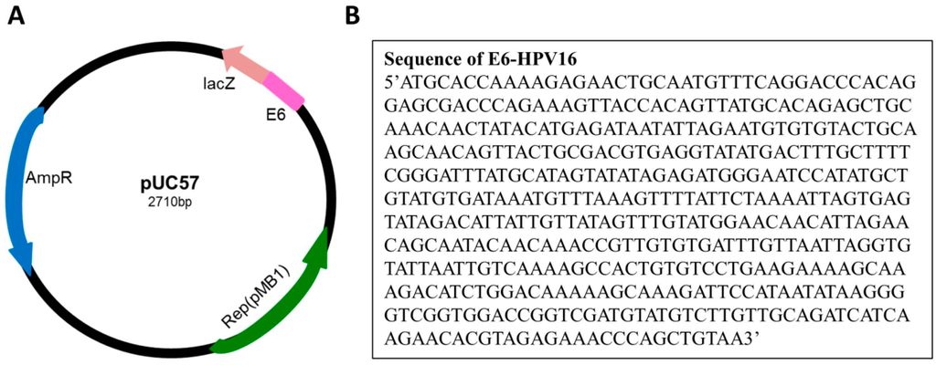 (A) Scheme of the pUC-57 vector with cloned E6 gene of HPV16. The construction of human E6-HPV16-pUC57 plasmid was purchased from Genewiz Company (GENEWIZ, South Plainfield, NJ, USA); (B) Nucleotide sequence of E6-HPV16 gene.
