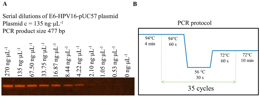 Optimization of template E6-HPV16-pUC57 plasmid concentration and scheme of standard PCR conditions: (A) finding the optimal concentration of DNA template for polymerase chain reaction (PCR); and (B) PCR protocol.
