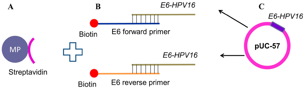 Scheme of DNA nanoconstruct of biotin-modified oligonucleotides bound to E6-HPV16 oncogene joined to streptavidin modified MPs : (A) 100 µL (10 mg·mL−1) of commercial Dynabeads M-280 Streptavidin MPs; (B) E6-HPV16 complementary oligonucleotides biotinylated (forward and reverse) (20 µL, 100 µM) using Biotin 3′ end DNA Labeling Kit (Thermo Scientific, Waltham, MA, USA) were successfully conjugated with Dynabeads; and (C) E6-HPV16 DNA was amplified from E6-HPV16-pUC57 synthetic plasmid by PCR, which was subsequently purified and conjugated with the nanoconstruct.
