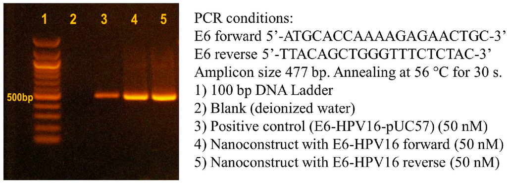 Optimization of PCR amplification and electrophoretic detection of E6-HPV16 oncogene cloned in pUC57 plasmid was evaluated prior to starting the rest of the experiments to evaluate the optimal conditions for PCR. The highest observed yield was achieved using 270 ng of E6-HPV16-pUC57 plasmid template and using the lowest concentrations of the PCR chemicals (175 µM of dNTPs, 1.4 mM MgCl2, 0.3 µM of each primer and 0.45 units of Taq polymerase per 25 µL).
