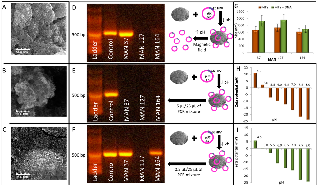 Isolation and detection of E6-HPV16-pUC57 plasmid using different “homemade” magnetiyable particles (MPs): (A–C) SEM microphotographs of MPs used in DNA isolation procedure (MAN-37, MAN-127 and MAN-164 respectively); (D) PCR amplification of E6-HPV16 gene in pUC-57 plasmid after elution from MPs; (E) PCR amplification of E6-HPV16 gene from 5 µL of MPs with bound DNA; (F) PCR amplification of E6-HPV16 gene from 0.5 µL of MPs with bound DNA; (G) the average size of MAN-37, 127 and 164 before and after binding with DNA; (H) the dependence of MAN-37 zeta potential on pH; and (I) the dependence of zeta potential of MAN-37 with bound DNA on pH.