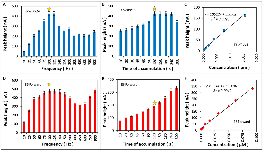 Optimization of electrochemical detection of E6-HPV16 gene and E6 forward primer (E6 Fw) were as follows: (A) frequency; (B) time of accumulation; and (C) calibration curve for E6-HPV16 gene; (D) frequency; (E) time of accumulation; and (F) calibration curve for E6 forward primer. All electrochemical measurements were provided by AdTS SWV in acetate buffer, pH 5.0, with an initial potential 0.0 V, end potential −1.7 V, amplitude 0.025 V, step potential 0.005 V. 100 Hz of frequency and 120 s of time of accumulation were selected as optimal conditions (yellow asterisks).