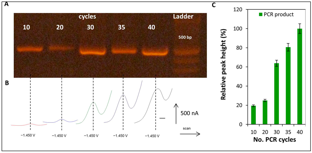 (A) Gel electrophoresis and (B) electrochemical analysis of PCR product (PCR of E6-HPV16-pUC57 plasmid set of E6 primers) obtained after 10, 20, 30, 35, and 40 PCR cycles. Expected size was 477 bp, corresponded to E6-HPV16 gene. Gel electrophoresis conditions: 1% agarose gel, 1% TAE buffer. Electrochemical conditions: See optimized conditions from Figure 7B; (C) Dependence of the relative CA peak height on the number of PCR cycles.